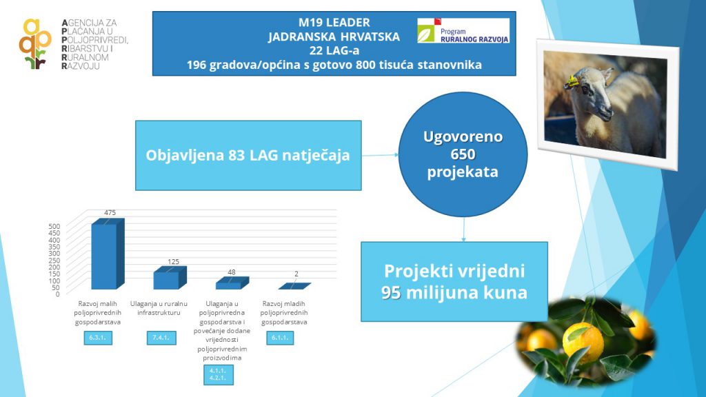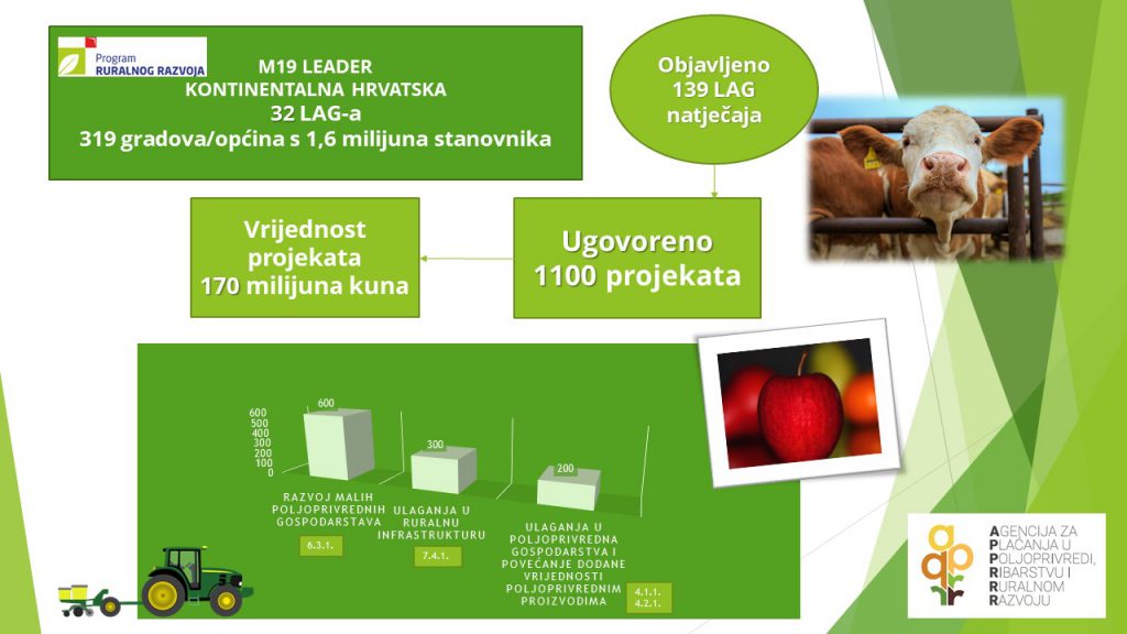 U posljednje tri i pol godine LAG-ovi su objavili 222 LAG natječaja u cjelokupnoj vrijednosti alociranih sredstava (100%), odabrali su na svojoj razini gotovo 1750 projekata u vrijednosti 264 milijuna kuna (73%), Agencija za plaćanja je ugovorila preko 1400 projekata u vrijednosti 204 milijuna kuna (56%) te je završeno 254 projekta i isplaćeno preko 62 milijuna kuna (17%). Riječ je o manjim projektima gdje je potpora maksimalne vrijednosti 100.000,00 EUR, a iznos isplaćenih sredstava u posljednje vrijeme kontinuirano raste te se samo do kraja ove godine planira isplatiti još 30 milijuna kuna.